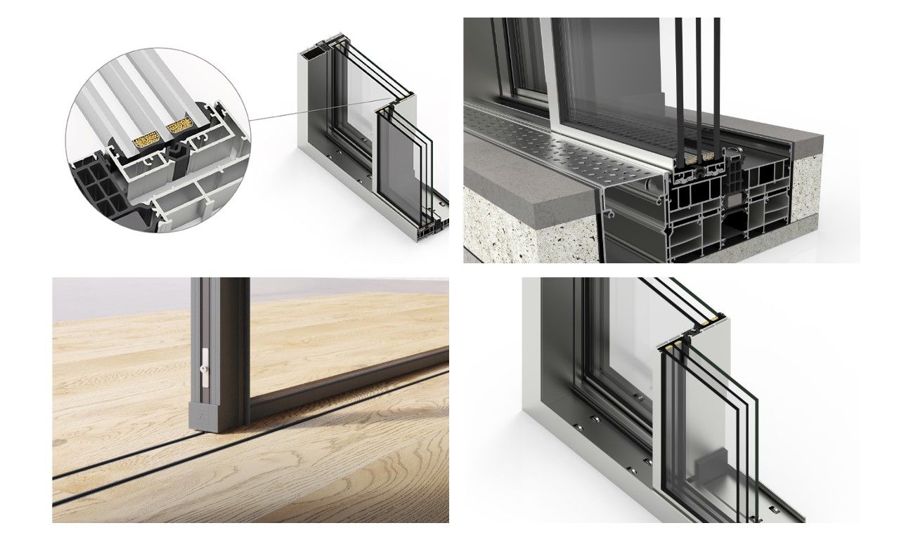 La face vue centrale est de seulement 20 mm, la latérale de 77 mm. et la haute ou basse de 57 mm. Il est également possible de cacher totalement les dormants.