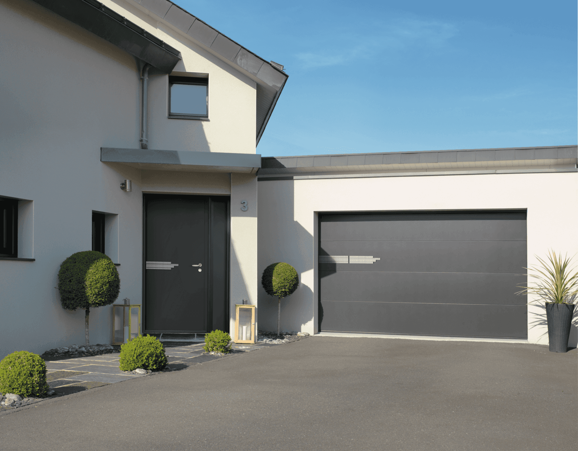 DIEUDONNE attache beaucoup d’importance à ces détails qui font la différence ; pas moins de 15 modèles de portes de garage sont associés au design de la porte d’entrée et du portail.